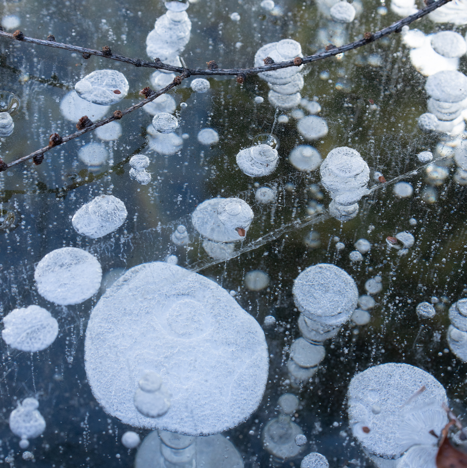 中盤に差しかかる頃、視界がひらけてくる。しばらく歩いていると、ふと右手に視線を持っていかれた。登山道のすぐ脇を流れる川が、まるごと凍っている。